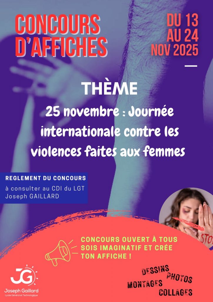 Le lycée Joseph Gaillard, pleinement engagé contre les violences sexistes, a proposé des actions de sensibilisation à destination des élèves et des étudiants à l’occasion de la journée internationale pour l’élimination de la violence à l’égard des femmes le mardi 25  Novembre 2026. Cette action proposée par mesdames Alba et Parasmo respectivement référente égalité et professeure documentaliste s’est déroulée en deux temps. Un concours d’affiches ouvert à tout-e-s les élèves et étudiant-e-s du lycée qui consistait à concevoir des d’affiches visant à prévenir, dénoncer ou lutter contre les violences faites aux filles et aux femmes en France ou dans le monde. L’heureux ou heureuse gagnante recevra en guise de prix le roman « la nuit au cœur» de Natacha Appanah prix Femina 2025 qui narre trois histoires de femmes victimes de la violence de leur compagnon.   Une dizaine d’affiches ont été déposées. Les prix seront remis lors des évènements organisés dans l’établissement dans le cadre de la journée du 08 mars 2026. Atelier sur les différentes facettes du sexisme, présenté de façon interactive, en partenariat avec l’association Culture Egalité, association féministe de lutte pour le droit des femmes et les droits humains. Les deux intervenantes ont abordé les diverses formes de sexisme dit ordinaire (masqué, hostile, harcèlement de rue…) ainsi que le harcèlement dans l’univers professionnel et sur les réseaux sociaux. Lors de cet atelier le violentomètre a également servi comme outil de détection des violences. Environ 80 élèves et étudiants ont participé à cet atelier.
